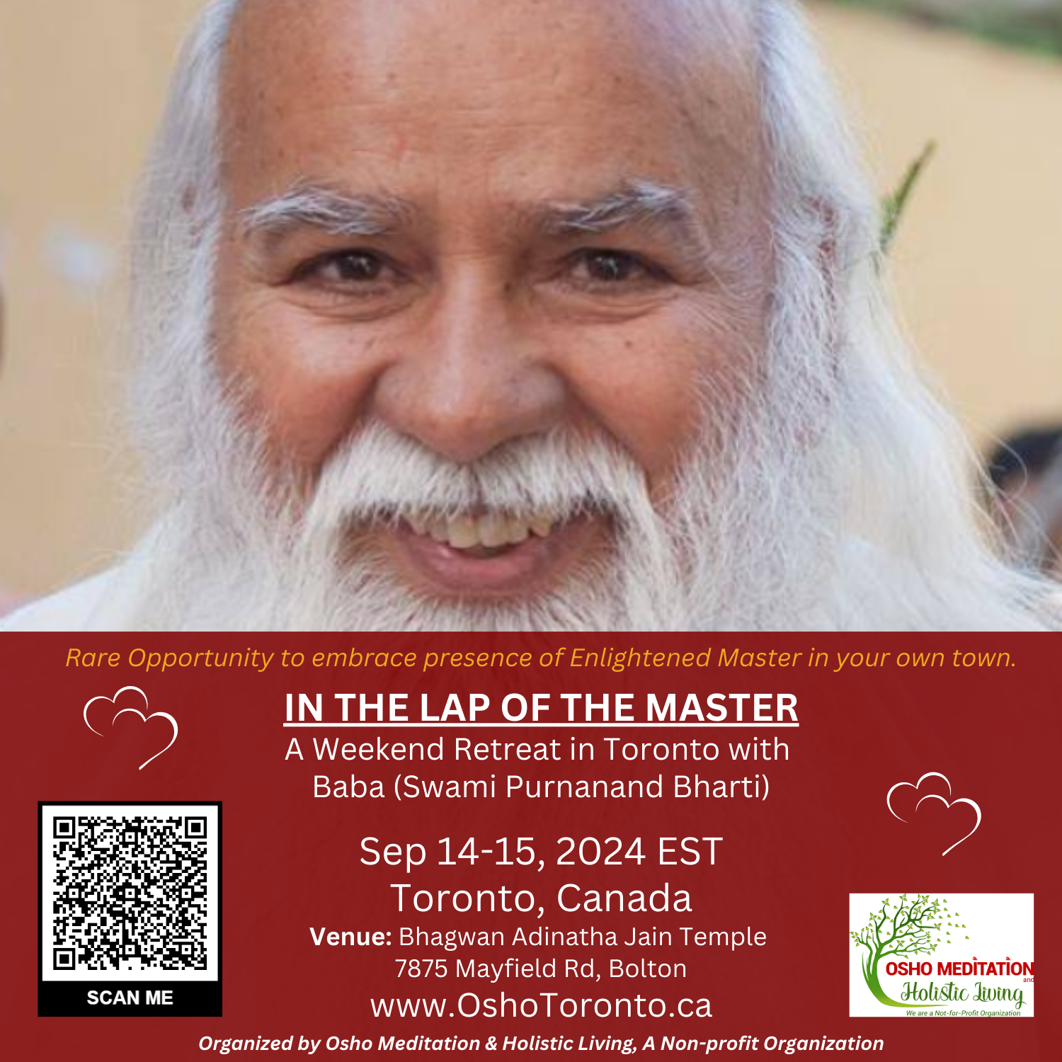 Baba is a Osho disciple and an enlightened master himself. He has been showering his love and blessings with all Osho lovers for over 38 years in meditation retreats across India and abroad across Europe, North America and Australia. Baba has been to Toronto in 2017 & 2019 before. And we are blessed again to be in his presence this September 2024. We invite you to experience HIS GRACE.